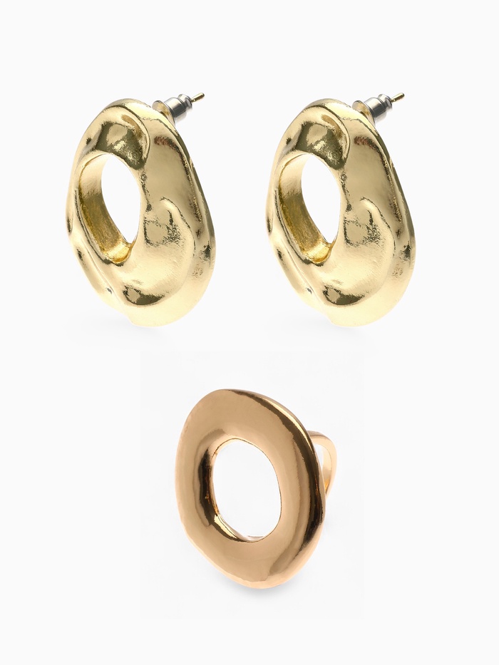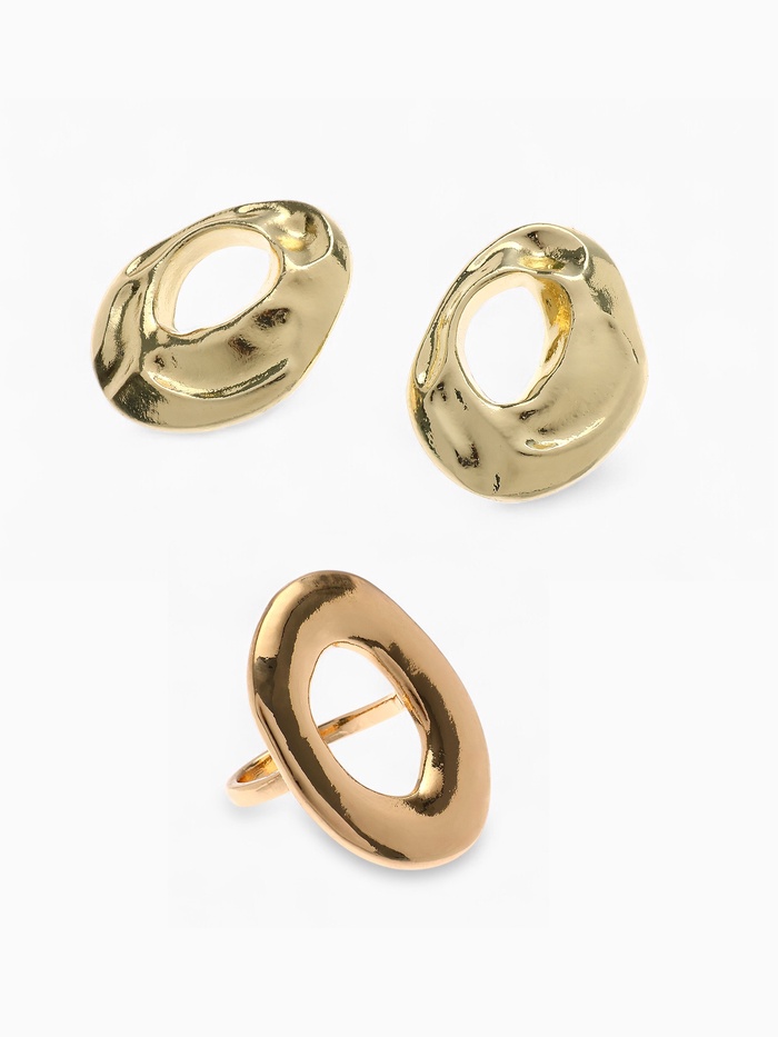 Этот стильный набор из двух предметов — серьги и кольцо «Мятый круг» — станет ярким акцентом в гардеробе современной женщины. Изготовленные в золотистом цвете, украшения привлекают внимание своей оригинальной текстурой и лаконичным дизайном, который легко сочетается с любыми образами — от деловых до повседневных.