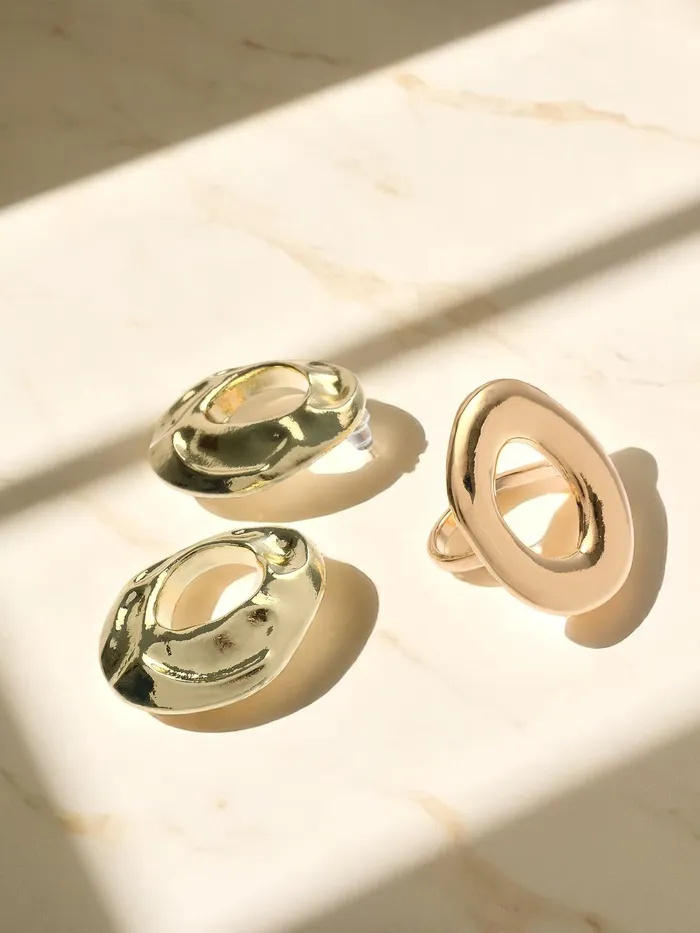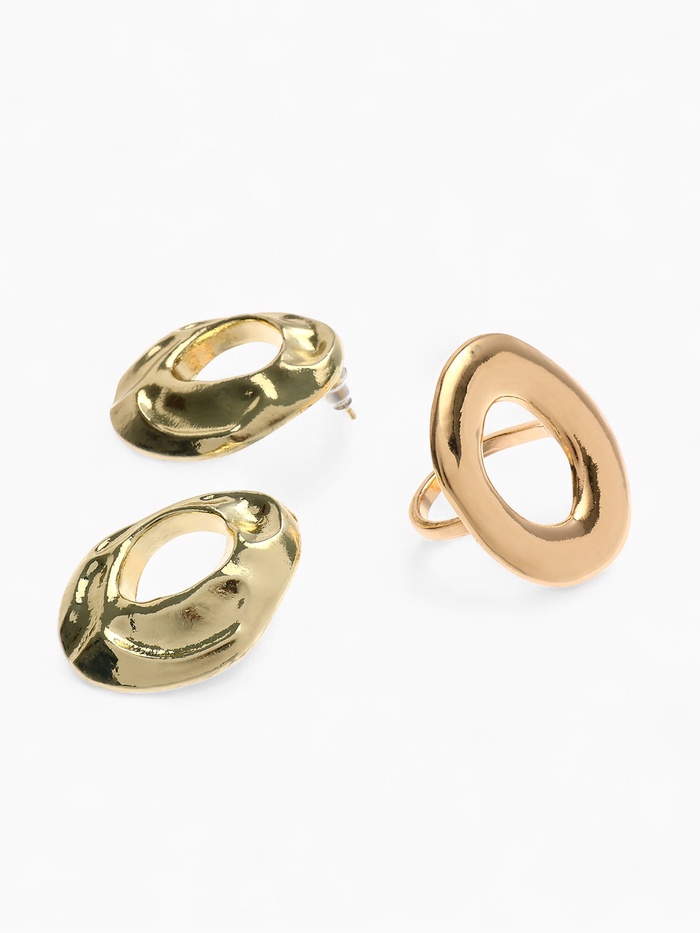 Особенность набора — уникальный эффект мятости, придающий изделиям особую изюминку и выразительность. Без вставок, выполненные из качественных материалов, серьги и кольцо обеспечивают комфортное ношение и долговечность. Золотая фурнитура подчеркивает изысканность и статусность аксессуаров, делая их подходящими для особых случаев и ежедневных образов.