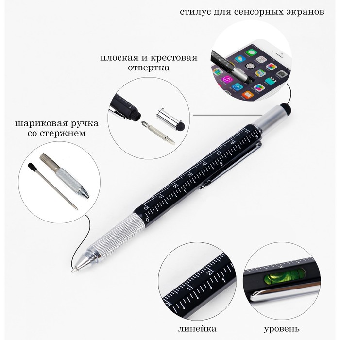 Ручка - мультитул 6 в 1 пригодится во многих ситуациях, из которых позволит выйти невредимым, так как помимо функции письма ручка обладает множеством дополнений: