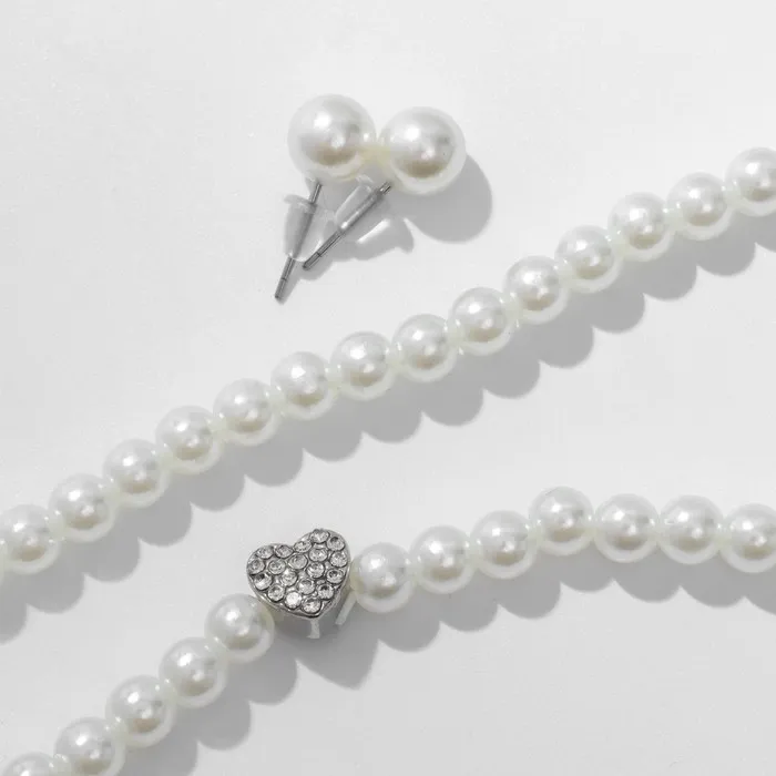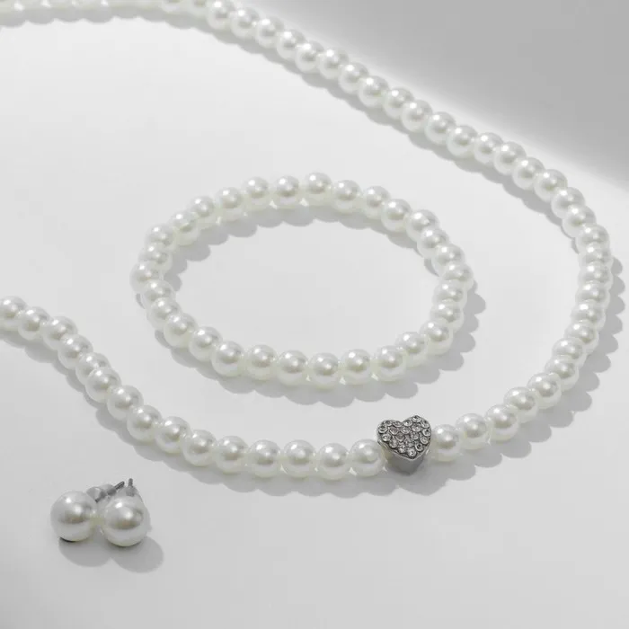 Набор 3 предмета: серьги, бусы, браслет «Жемчуг» сердце, цвет белый в серебре, 45 см — Характеристики