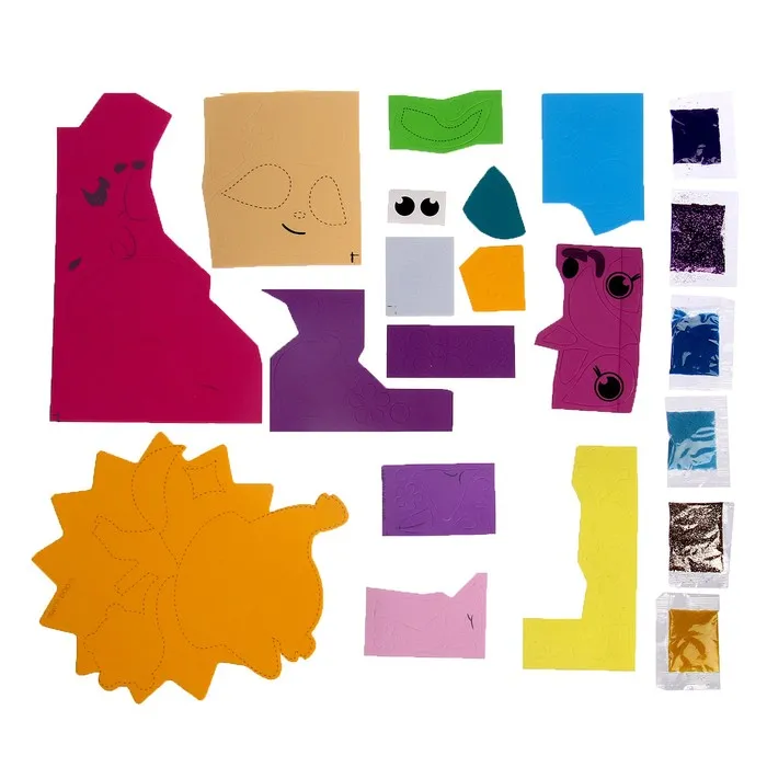- В комплект входят 2 картинки, основа из EVA, песок 6 цветов и мягкие самоклеящиеся детали, что позволяет детям проявить свои творческие способности.