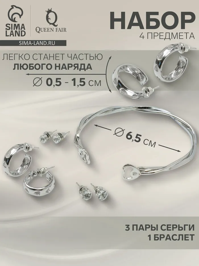 Набор 4 предмета: 3 пары серьги, 1 браслет «Нежность», цвет белый в серебре — Характеристики