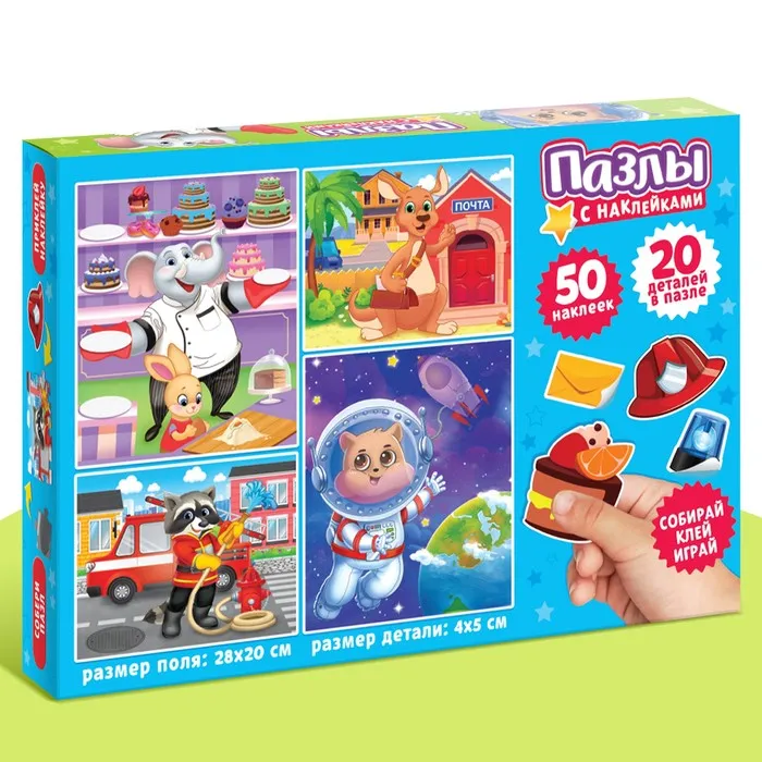 Набор 4 в 1 пазлы с наклейками «Профессии», 50 наклеек, 4 пазла по 20 деталей — Характеристики