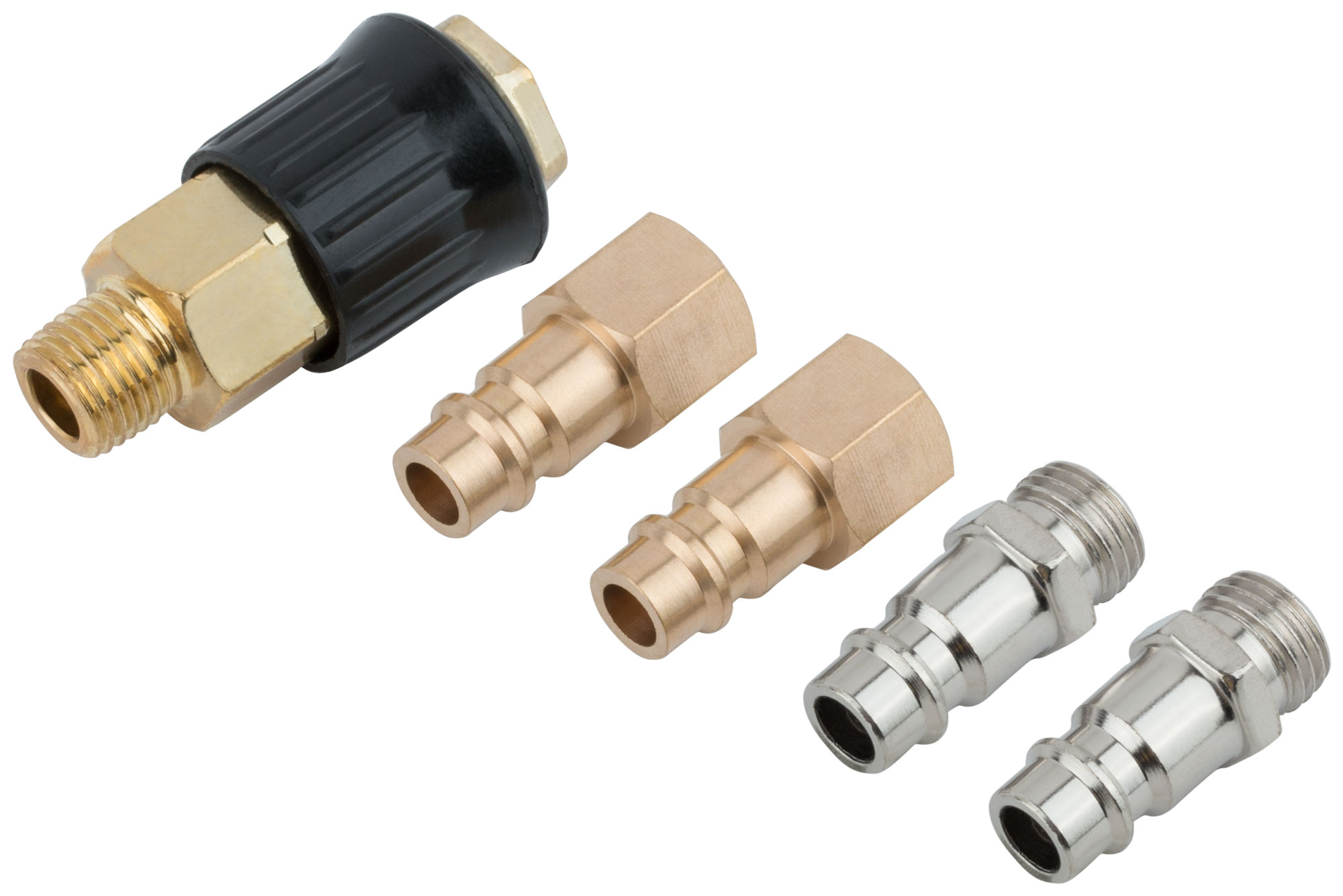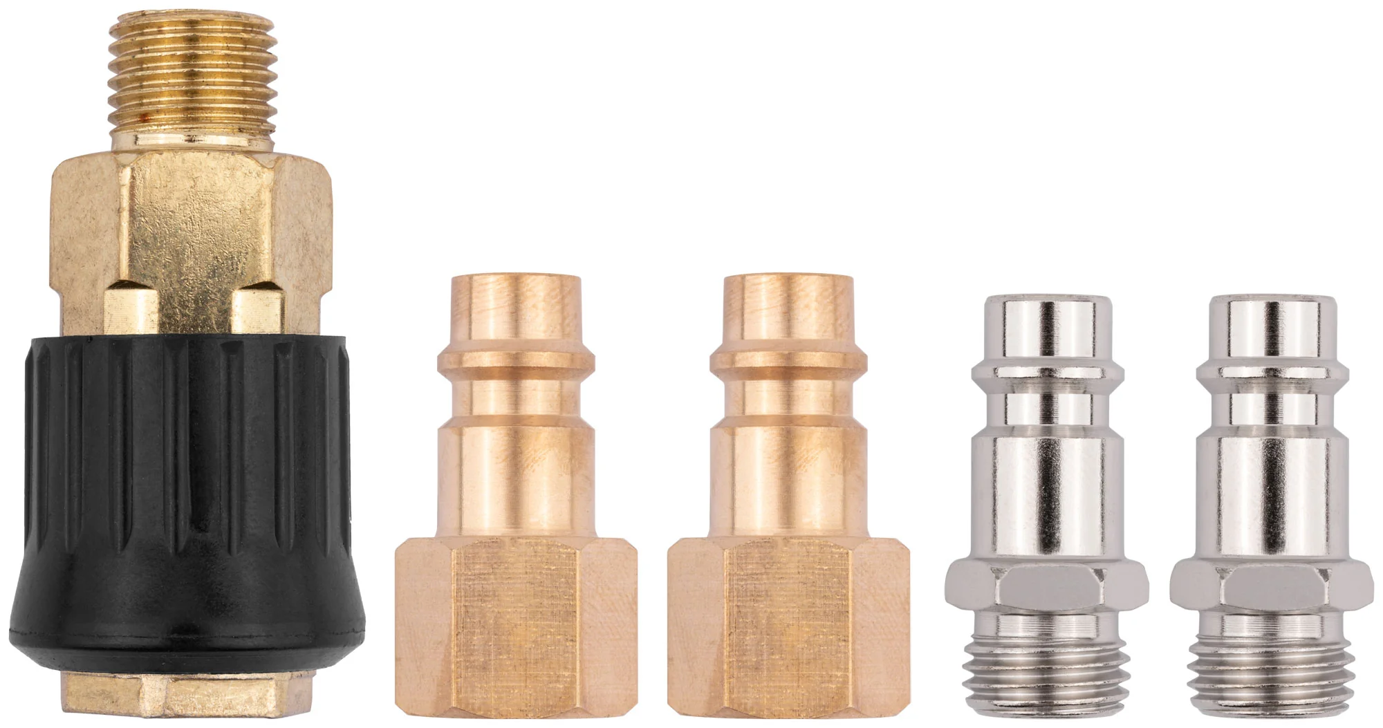 Набор включает в себя 2 адаптера с внешней резьбой и 2 с внутренней, а также универсальный адаптер на шланг с запорным клапаном. Все элементы имеют резьбу 1/4'' и шагом резьбы 1,5 мм. Это делает их совместимыми с широким спектром оборудования.