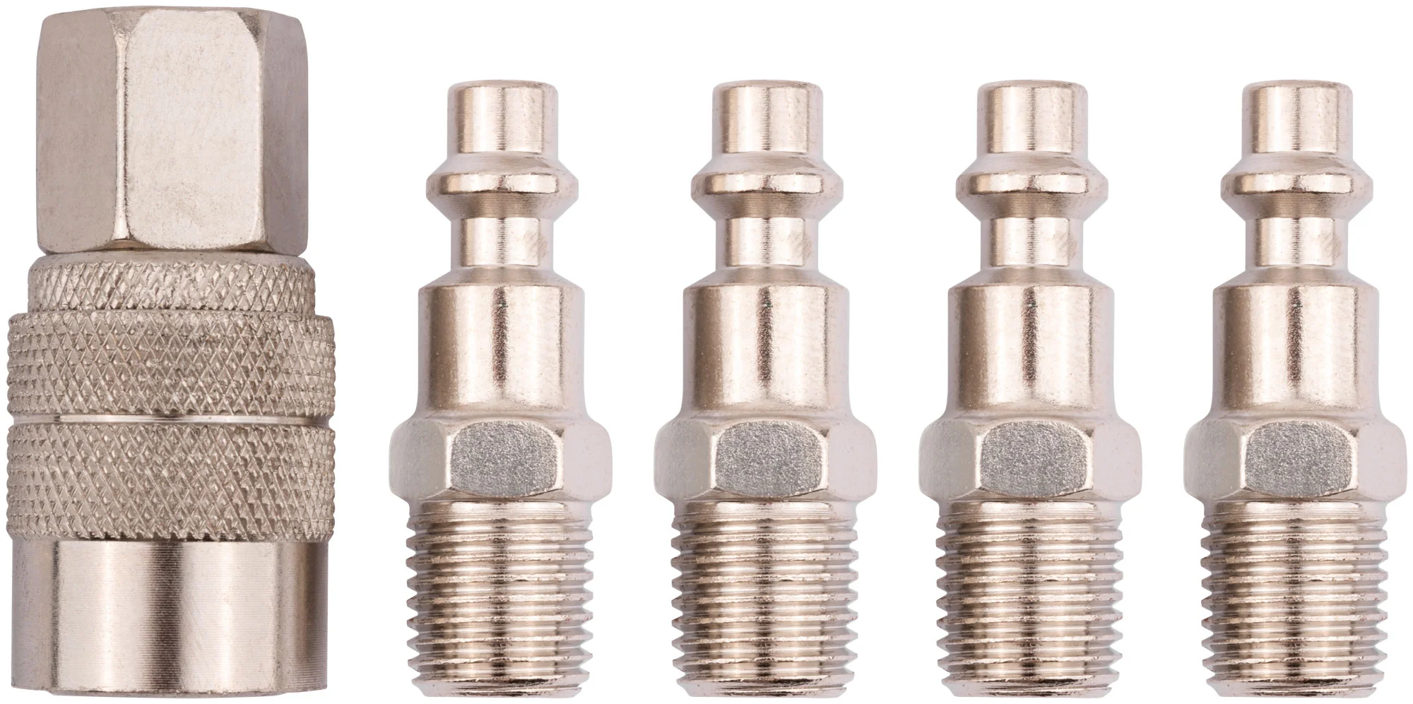 Набор включает 4 ниппеля с наружной резьбой 1/4'' и 1 муфту с запорным клапаном и внутренней резьбой 1/4''. Все элементы изготовлены из прочной стали, что обеспечивает долговечность и устойчивость к износу. Компактные размеры набора позволяют удобно хранить и транспортировать его.