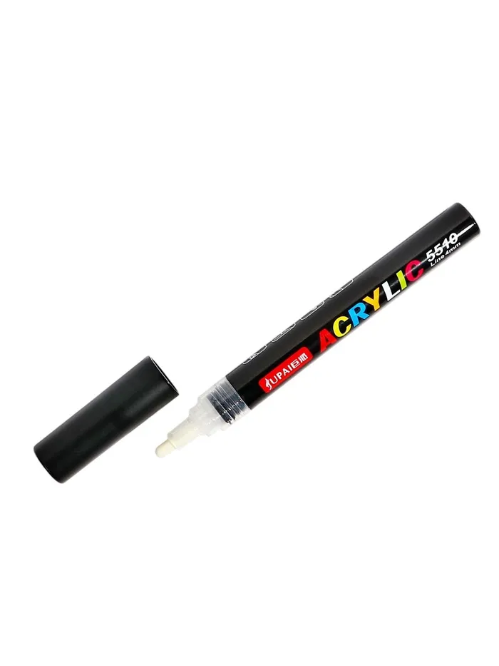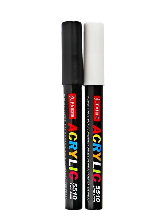 Набор из двух акриловых маркеров с пулевидным наконечником 4 мм — это базовые инструменты для рисования и декора. Черный и белый цвета подходят для создания контрастных работ, заливки и коррекции.