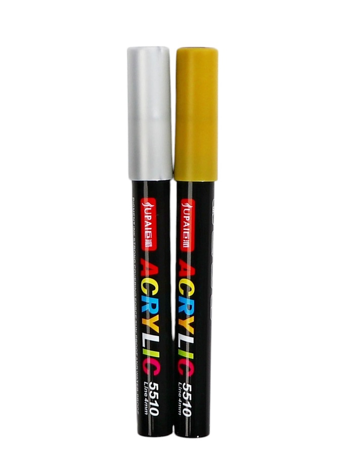 Набор из двух акриловых маркеров с пулевидным наконечником 4 мм — это инструменты для создания эффектных декоративных работ. Золотой и серебряный цвета добавляют блеск и изысканность вашим проектам.