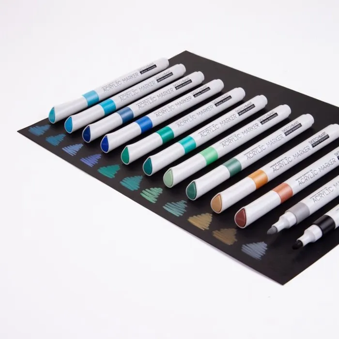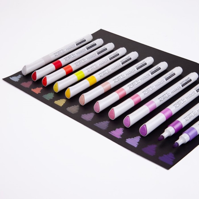 Набор из 24 акриловых маркеров «SKETCH&ART» различных цветов для рисования, декорирования, дизайнерских работ на любых поверхностях: холст, бумага, дерево, пластик, металл, камень, стекло, одежда, керамика.Корпус маркеров изготовлен из полипропилена - легкий и ударопрочный. Плотно защелкивающийся колпачок обеспечивает долгую сохранность чернил от высыхания.Маркер имеет пулевидный наконечник из износостойкого волокна с шириной линии 1-3 мм. Нетоксичные пигментные чернила на водной основе с высокой степенью укрывистости быстро сохнут на поверхности, оставляя яркий след. Краски до высыхания можно смешать или растушевать кистью для достижения плавных переходов.Маркеры упакованы в картонную упаковку с эффектом Soft Touch и узнаваемым дизайном всей линейки «Sketch&Art». Размер: 149 x 180 x 35 мм.