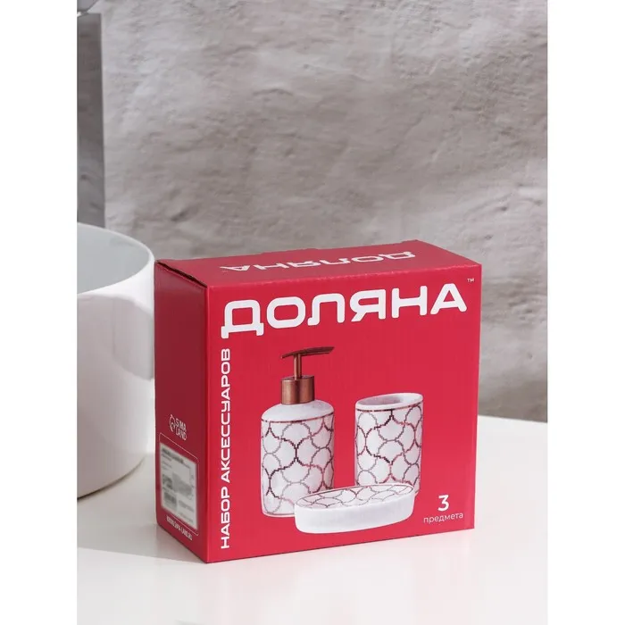 Набор аксессуаров организует пространство и станет стильным украшением Вашей ванной комнаты. За счет сдержанного дизайна данный керамический набор в ванную подойдет к любому дизайну ванной комнаты. Набор состоит из 3 предметов: дозатор, мыльница, стакан.