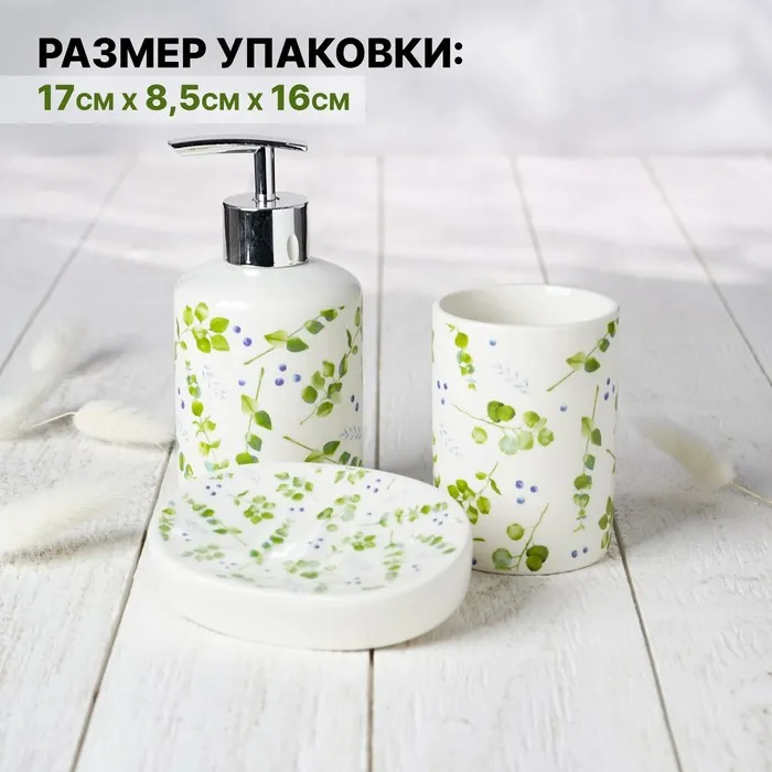 Набор аксессуаров для ванной комнаты Доляна «Эвкалипт», 3 предмета, мыльница, дозатор для мыла, стакан — Характеристики
