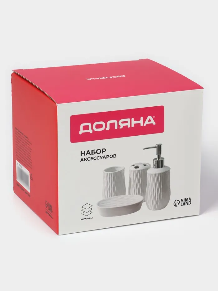 Набор аксессуаров для ванной комнаты Доляна «Течение», 4 предмета, дозатор 350 мл, мыльница, два стакана 300 мл, белый — Характеристики