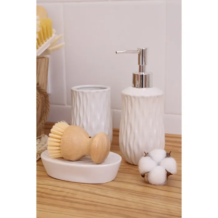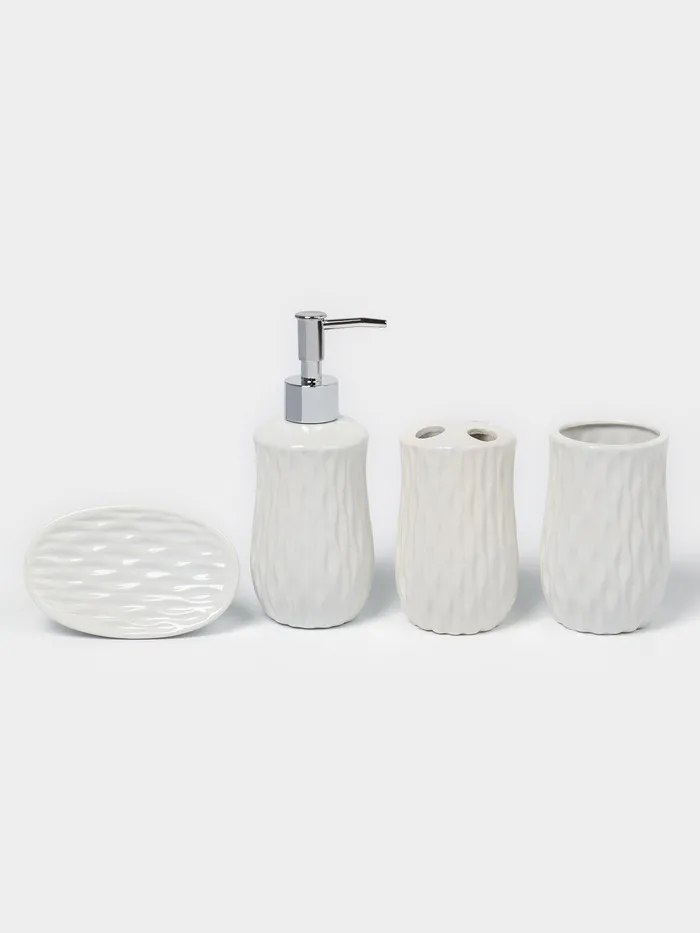 Набор аксессуаров организует пространство и станет стильным украшением Вашей ванной комнаты. За счет сдержанного дизайна данный керамический набор в ванную подойдет к любому дизайну ванной комнаты. Набор состоит из 4 предметов: 2 стакана, мыльница, дозатор.