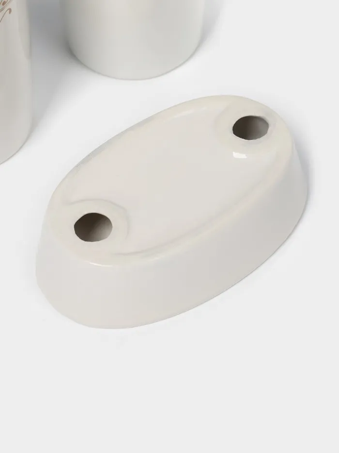 Набор аксессуаров организует пространство и станет стильным украшением Вашей ванной комнаты. За счет сдержанного дизайна данный керамический набор в ванную подойдет к любому дизайну ванной комнаты. Набор состоит из 4 предметов: 2 стакана, мыльница, дозатор.