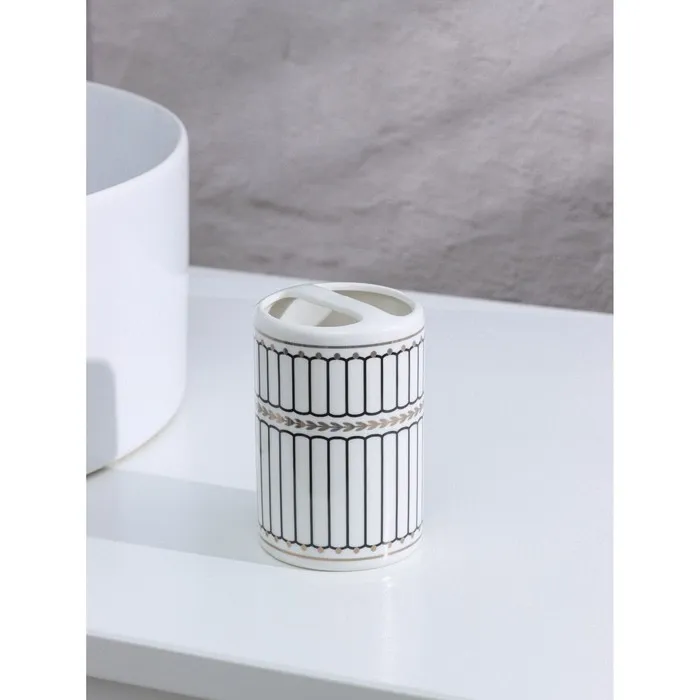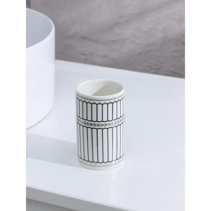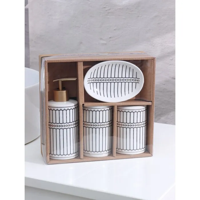 Набор аксессуаров организует пространство и станет стильным украшением Вашей ванной комнаты. За счет сдержанного дизайна данный керамический набор в ванную подойдет к любому дизайну ванной комнаты. Набор состоит из 4 предметов: 2 стакана, мыльница, дозатор.