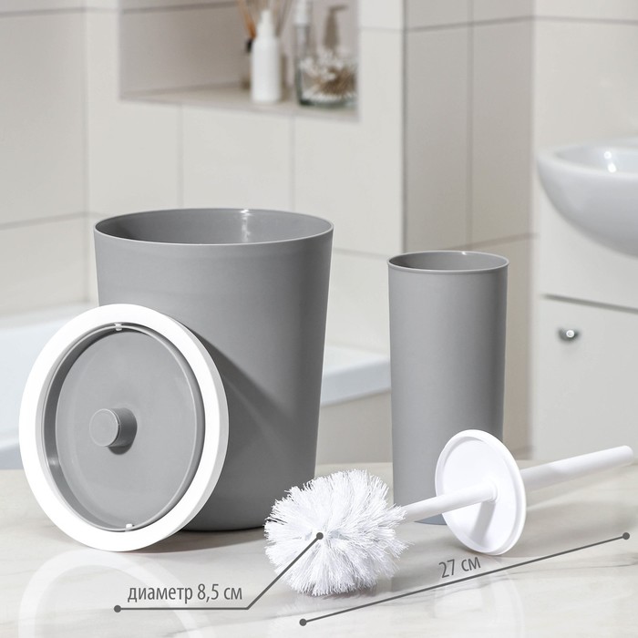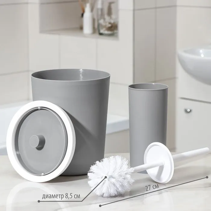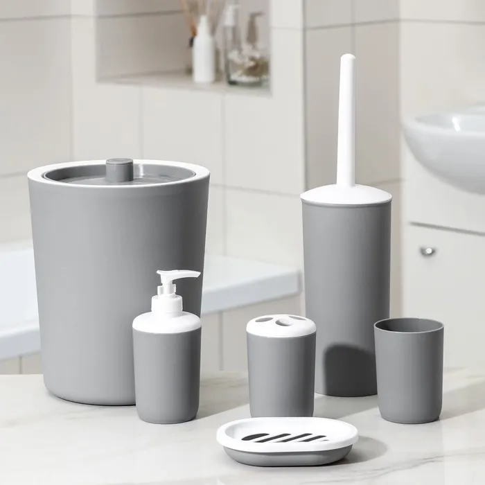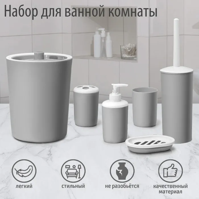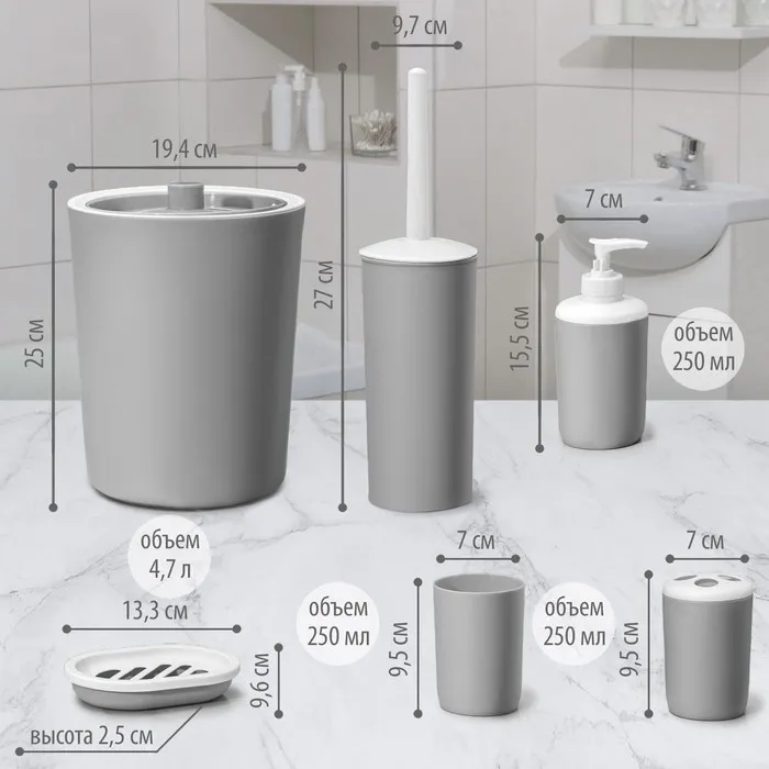 Набор аксессуаров для ванной комнаты «Лайт», 6 предметов (мыльница, дозатор, 2 стакана, ёршик, ведро), цвет серый — Характеристики