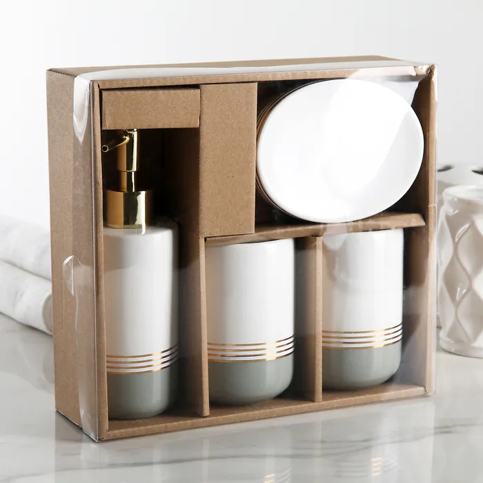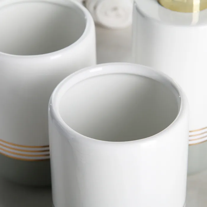 Набор аксессуаров организует пространство и станет стильным украшением Вашей ванной комнаты. За счет сдержанного дизайна данный керамический набор в ванную подойдет к любому дизайну ванной комнаты. Набор состоит из 4 предметов: 2 стакана, мыльница, дозатор.