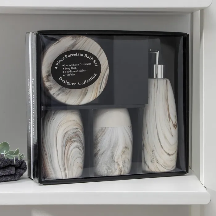 Набор аксессуаров организует пространство и станет стильным украшением Вашей ванной комнаты. За счет сдержанного дизайна данный керамический набор в ванную подойдет к любому дизайну ванной комнаты. Набор состоит из 4 предметов: 2 стакана, мыльница, дозатор.