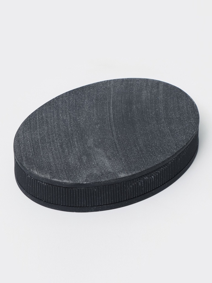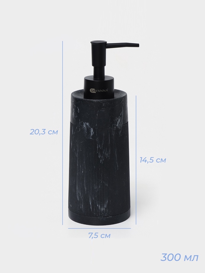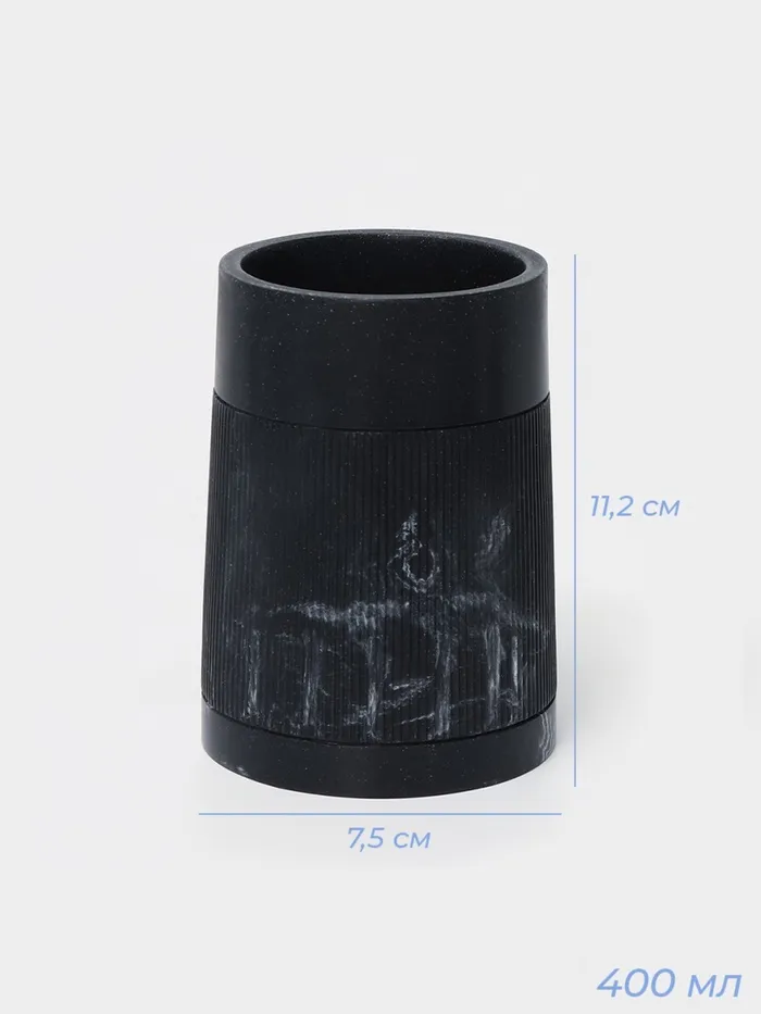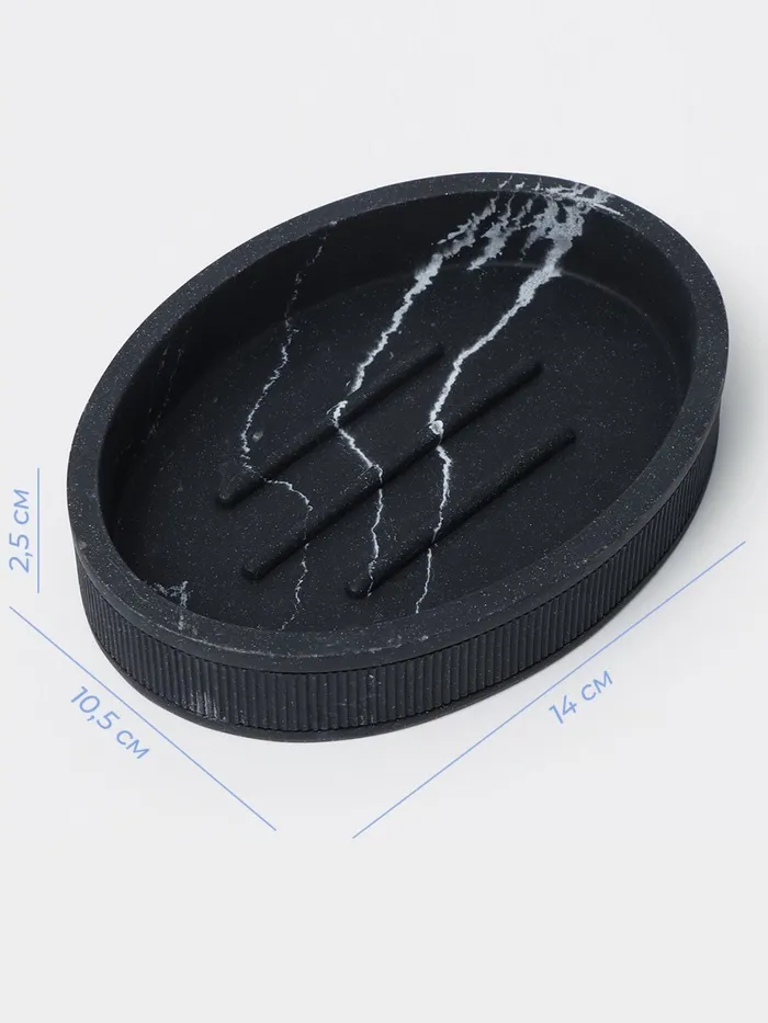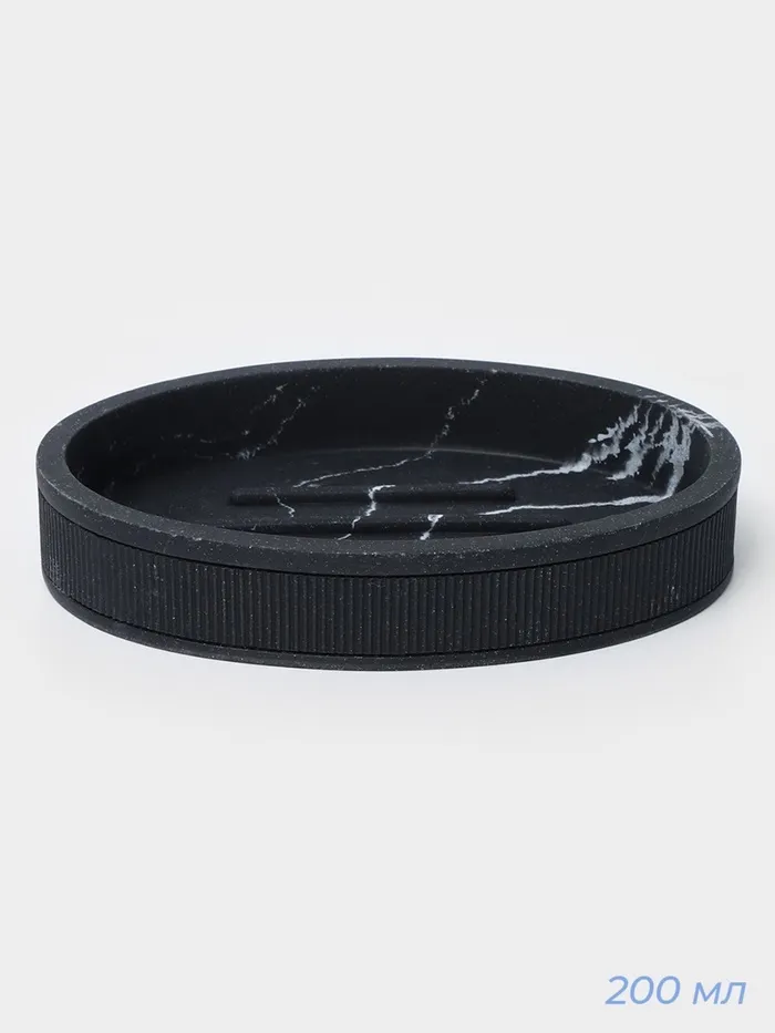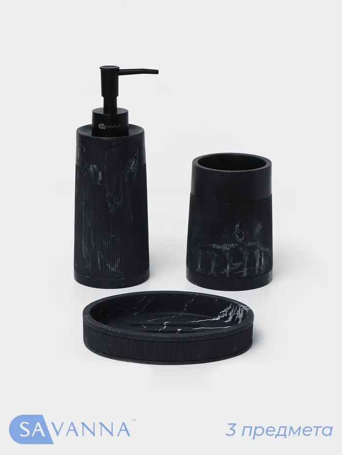 — В комплект входят три предмета: дозатор, стакан и мыльница, которые выполнены в чёрном цвете и украшены узорами.