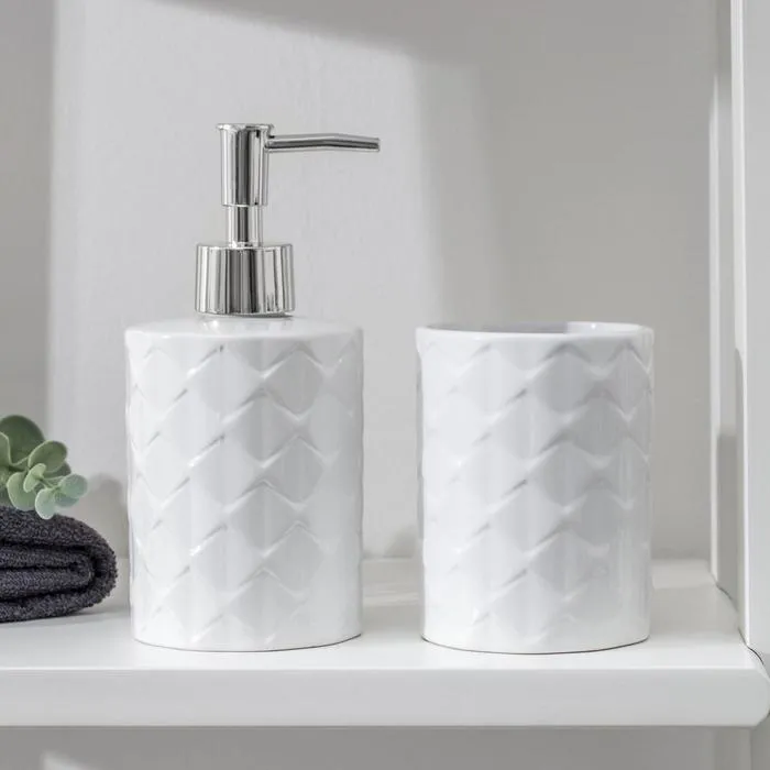 Набор аксессуаров организует пространство и станет стильным украшением Вашей ванной комнаты. За счет сдержанного дизайна данный керамический набор в ванную подойдет к любому дизайну ванной комнаты. Набор состоит из 4 предметов: 2 стакана, мыльница, дозатор.