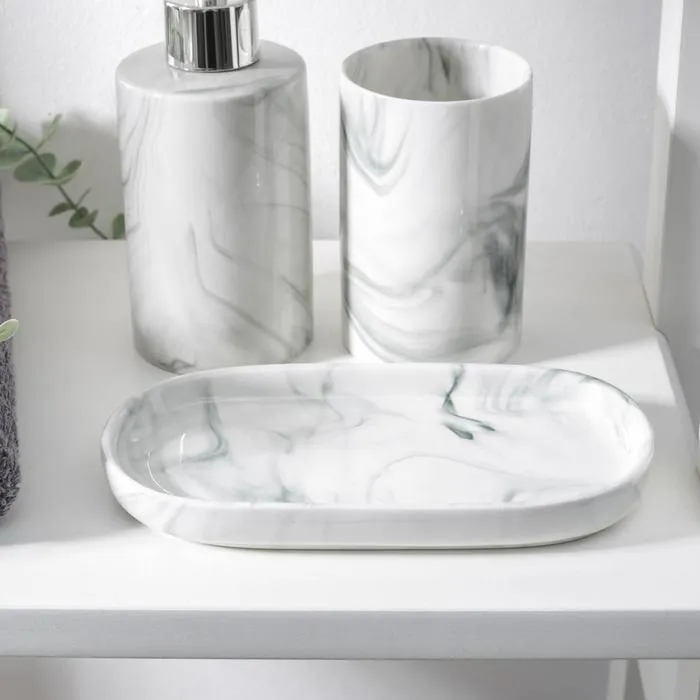 Набор аксессуаров организует пространство и станет стильным украшением Вашей ванной комнаты. За счет сдержанного дизайна данный керамический набор в ванную подойдет к любому дизайну ванной комнаты. Набор состоит из 3 предметов: стакан, мыльница, подставка.
