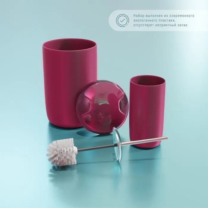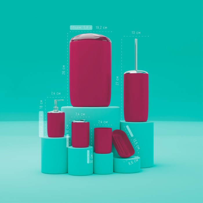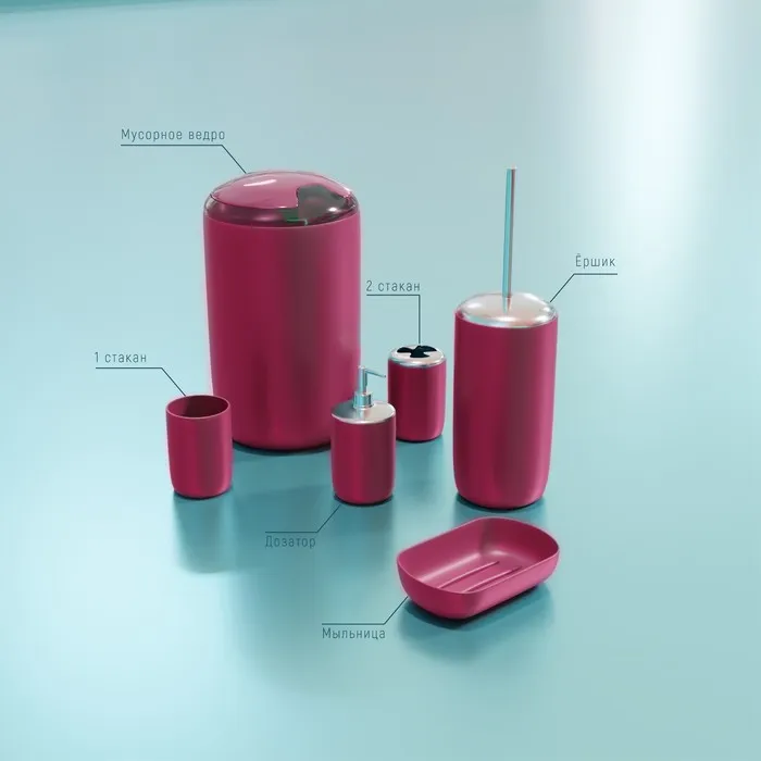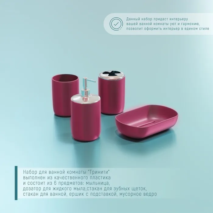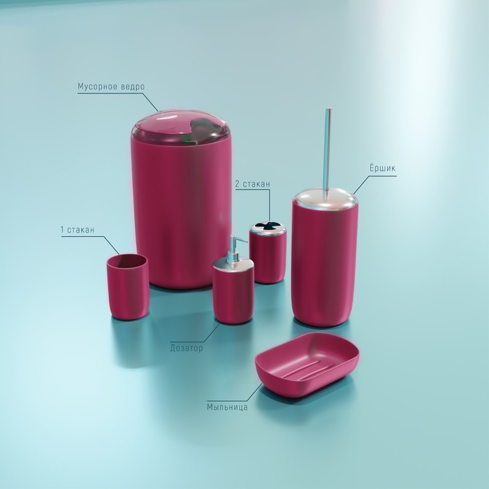 Набор аксессуаров для ванной комнаты «Тринити», 6 предметов, мыльница, дозатор для мыла, два стакана, ёрш, ведро, розовый — Характеристики
