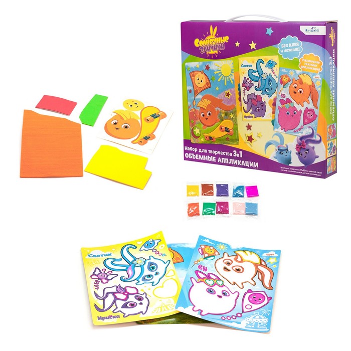 Набор аппликаций 3 в 1 «Солнечные зайчики» — это увлекательный способ для детей создать яркие картинки с любимыми героями нового популярного мультфильма. В наборе используются безопасные материалы, что исключает необходимость клея и ножниц, делая процесс создания максимально простым и интересным.