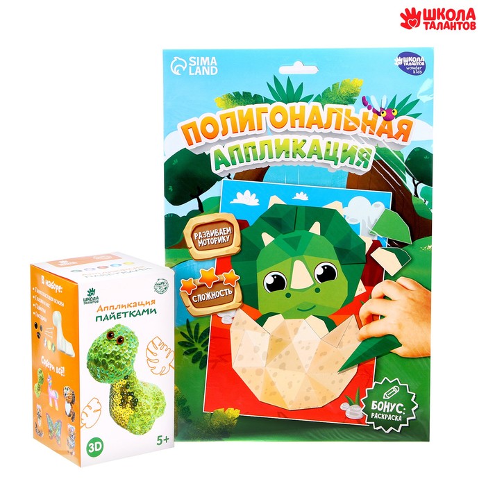 Набор для творчества включает в себя объемную аппликацию пайетками и полигональную аппликацию. Бонус! Раскраска наобороте.