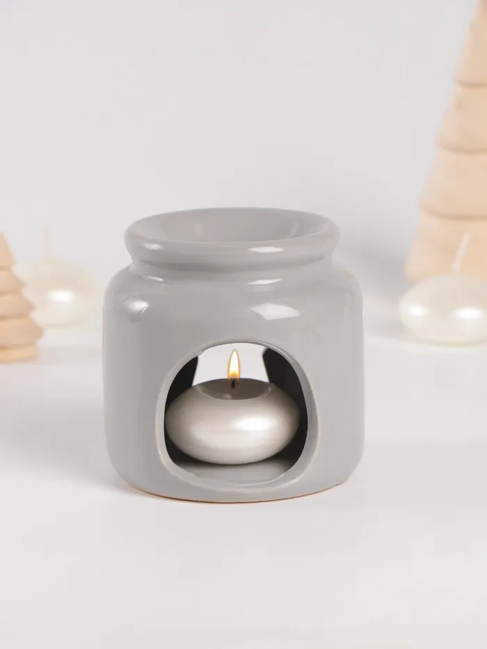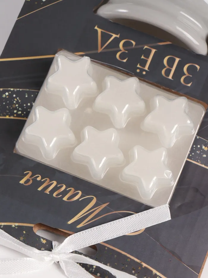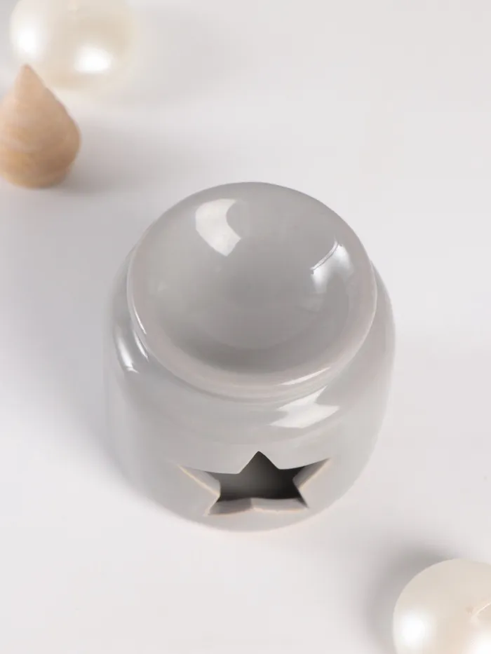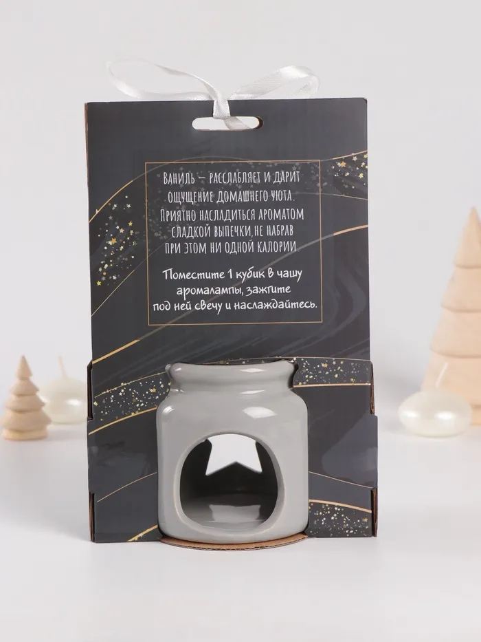 Этот элегантный набор в серых тонах — идеальное решение для создания атмосферы уюта. Комплект включает керамическую аромалампу в форме цилиндра высотой 8 см и ароматические восковые мельтсы с нежным ванильным ароматом, выполненные в виде звёзд.