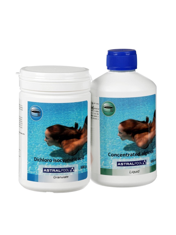 В набор входит: 0,5 кг Дихлора в гранулах и 0,5 л Альгицида концентрированного.
