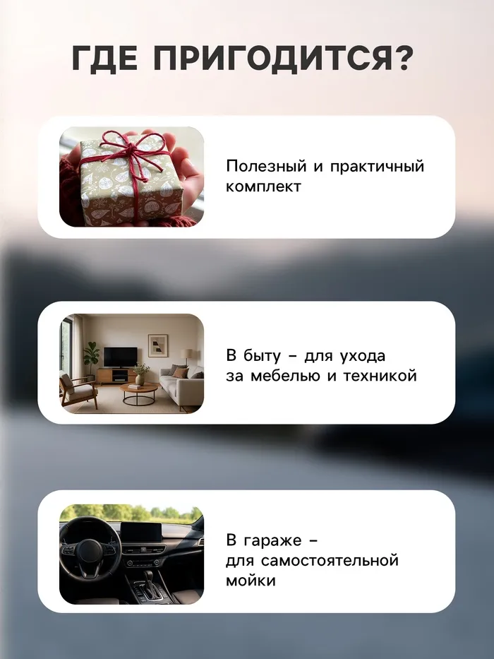 Этот комплект – идеальное решение для автолюбителей, которые ценят чистоту и порядок в своем транспортном средстве. Все предметы подобраны с учетом эффективности и удобства использования, что делает процесс уборки максимально комфортным.