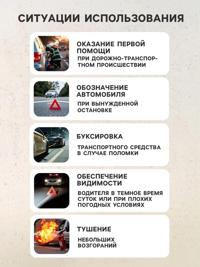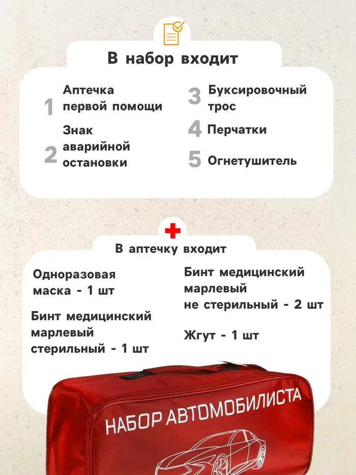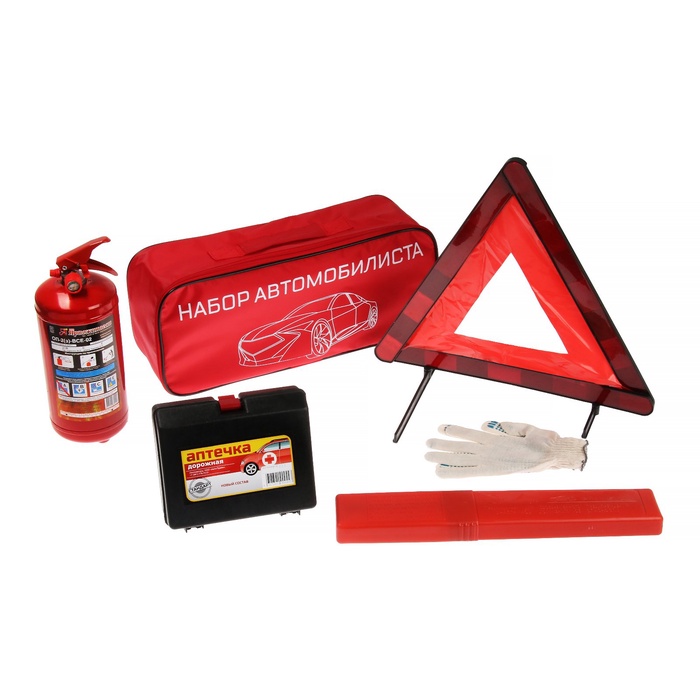 - Соответствие требованиям: включает все необходимые предметы, рекомендованные правилами дорожного движения;