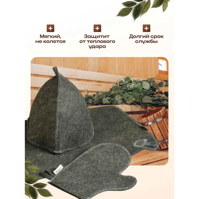 Для комфортного отдыха в парной возьмите с собой набор банных принадлежностей. Предметы из этого комплекта предохраняют тело от перегрева и являются средствами индивидуального пользования. Влажные изделия рекомендуется сушить в расправленном виде на горизонтальной поверхности. Принадлежности из войлока и фетра стирайте вручную при температуре воды 30 °C.