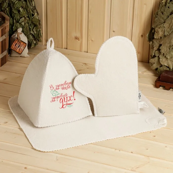 Набор для бани с вышивкой «Здоровый дух», 3 предмета: шапка, коврик, рукавица, шерсть 30%, полиэфир 70%, тёмный, «Добропаровъ»
