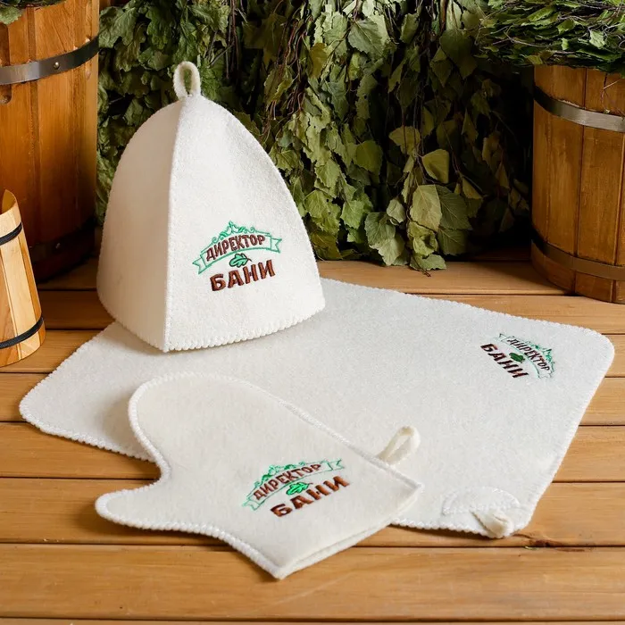 Набор для бани с вышивкой «Директор бани», 3 предмета: шапка, коврик, рукавица, шерсть 30%, полиэфир 70%, светлый, «Добропаровъ»