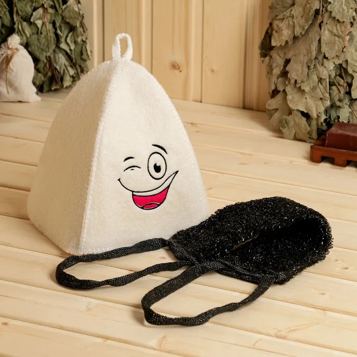 Набор банный "Смайл 1" Шапка с вышивкой, мочалка в коробке — Характеристики