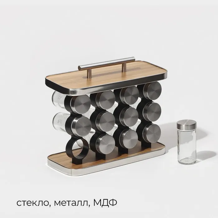 - Стильный дизайн: металлический корпус подставки и прозрачные баночки выглядят современно и элегантно.