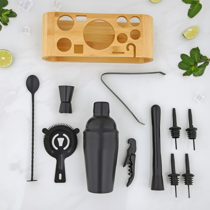 Набор бармена Black, 11 предметов на подставке, цвет чёрный — Характеристики