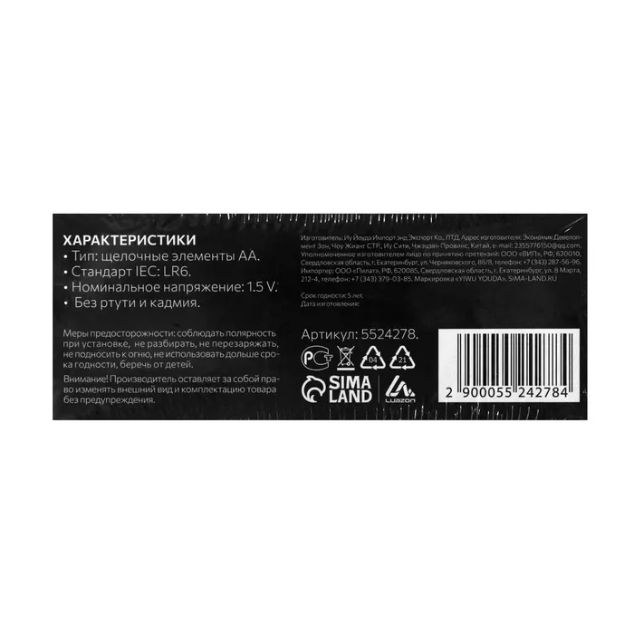 Набор батареек алкалиновых (щелочных) Luazon, AA, LR6, 24 штуки — Характеристики