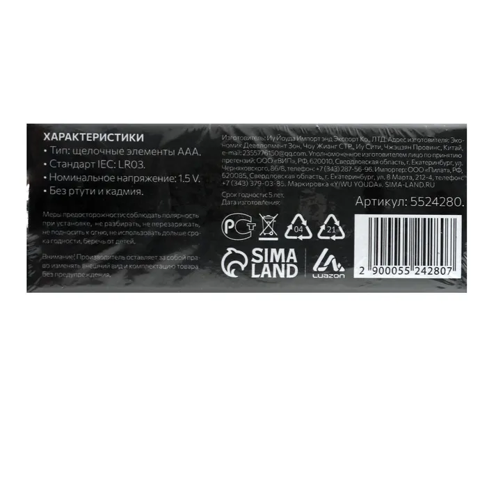 Набор батареек алкалиновых (щелочных) Luazon, AAA, LR03, 24 штуки — Характеристики
