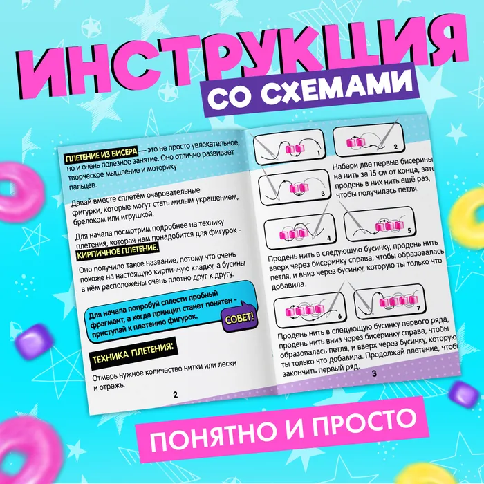 С этим набором ребёнок сделает 3 игрушки из бисера своими руками.