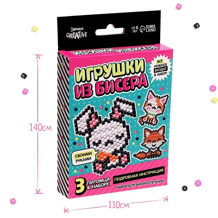 С этим набором ребёнок сделает 3 игрушки из бисера своими руками.