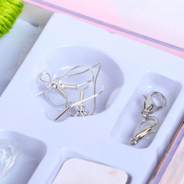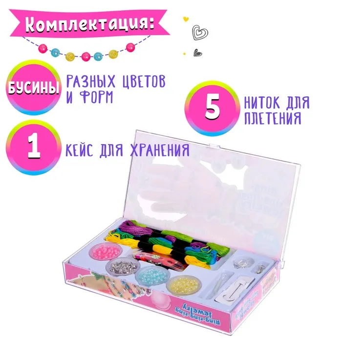 В комплекте есть всё необходимое: основа для изделий, бусины разных размеров, подвесы.