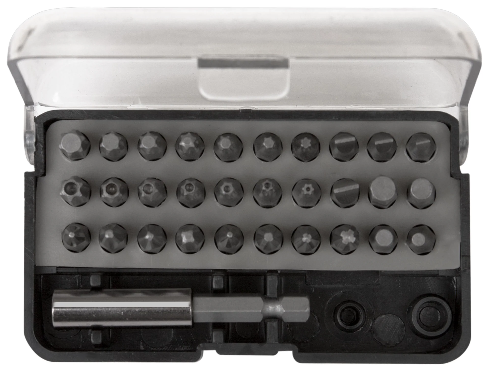 К преимуществам набора относятся высокая износостойкость бит и разнообразие профилей, включая Philips, Pozidriv, Slotted, Hex и Torx. Это делает набор универсальным инструментом для решения большинства задач на строительной площадке.