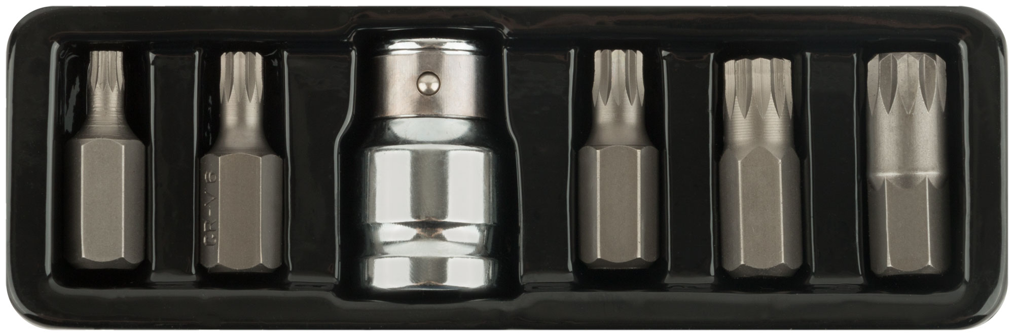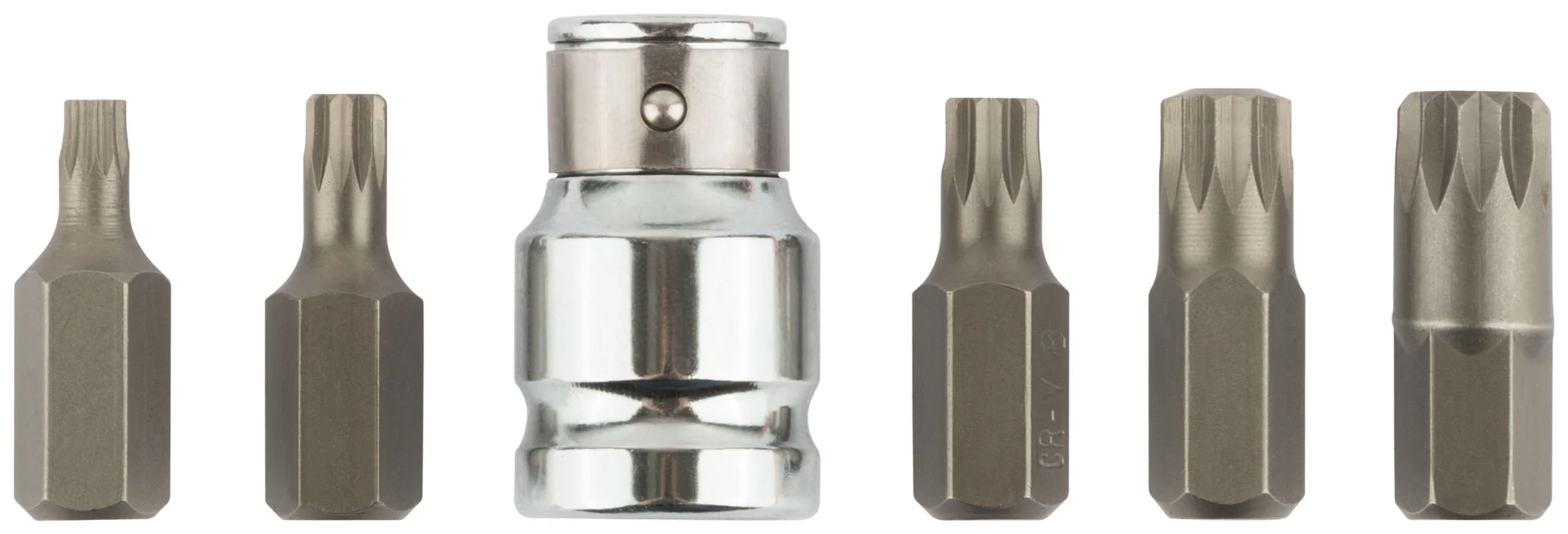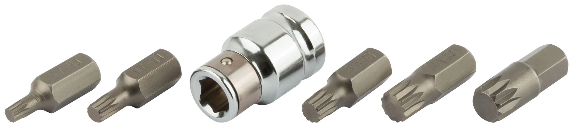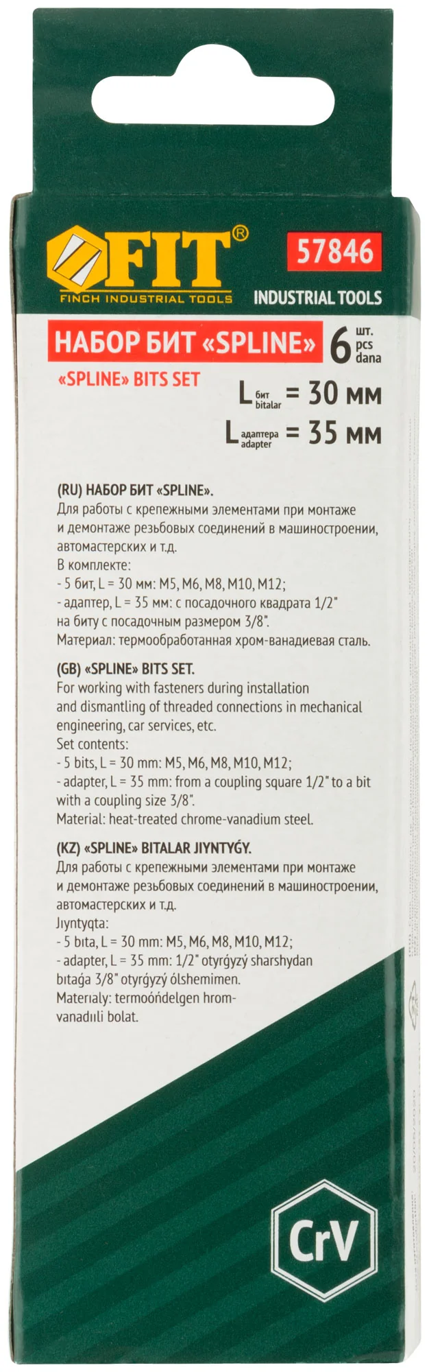 Биты изготовлены из хром-ванадиевой стали, что гарантирует их долговечность и устойчивость к износу. Комплект включает 5 бит длиной 30 мм (размеры М5, М6, М8, М10, М12) и адаптер с воротка на биту с посадочным диаметром 10 мм. Упакован в удобную коробку с подвесом для легкого хранения и транспортировки.