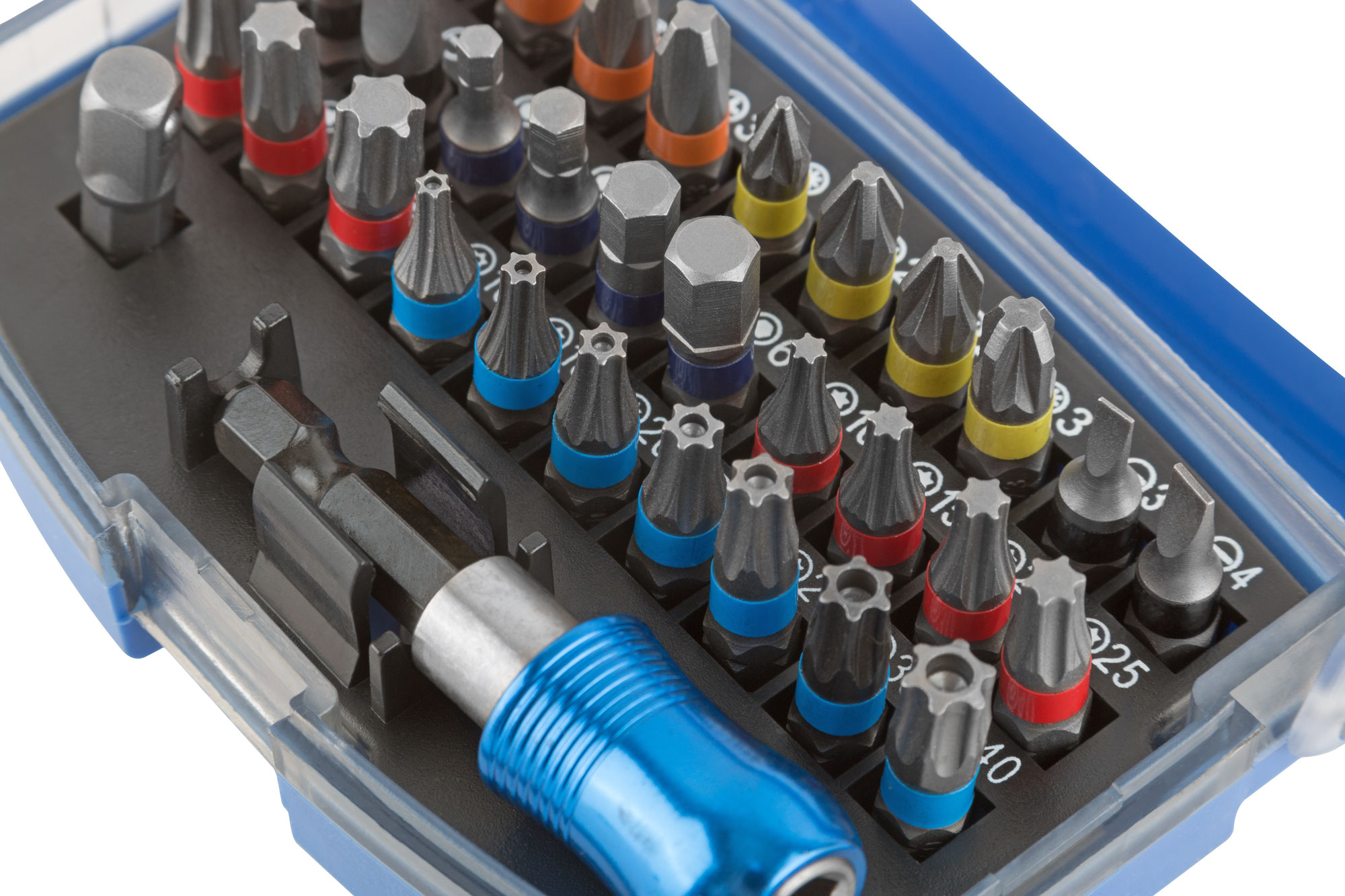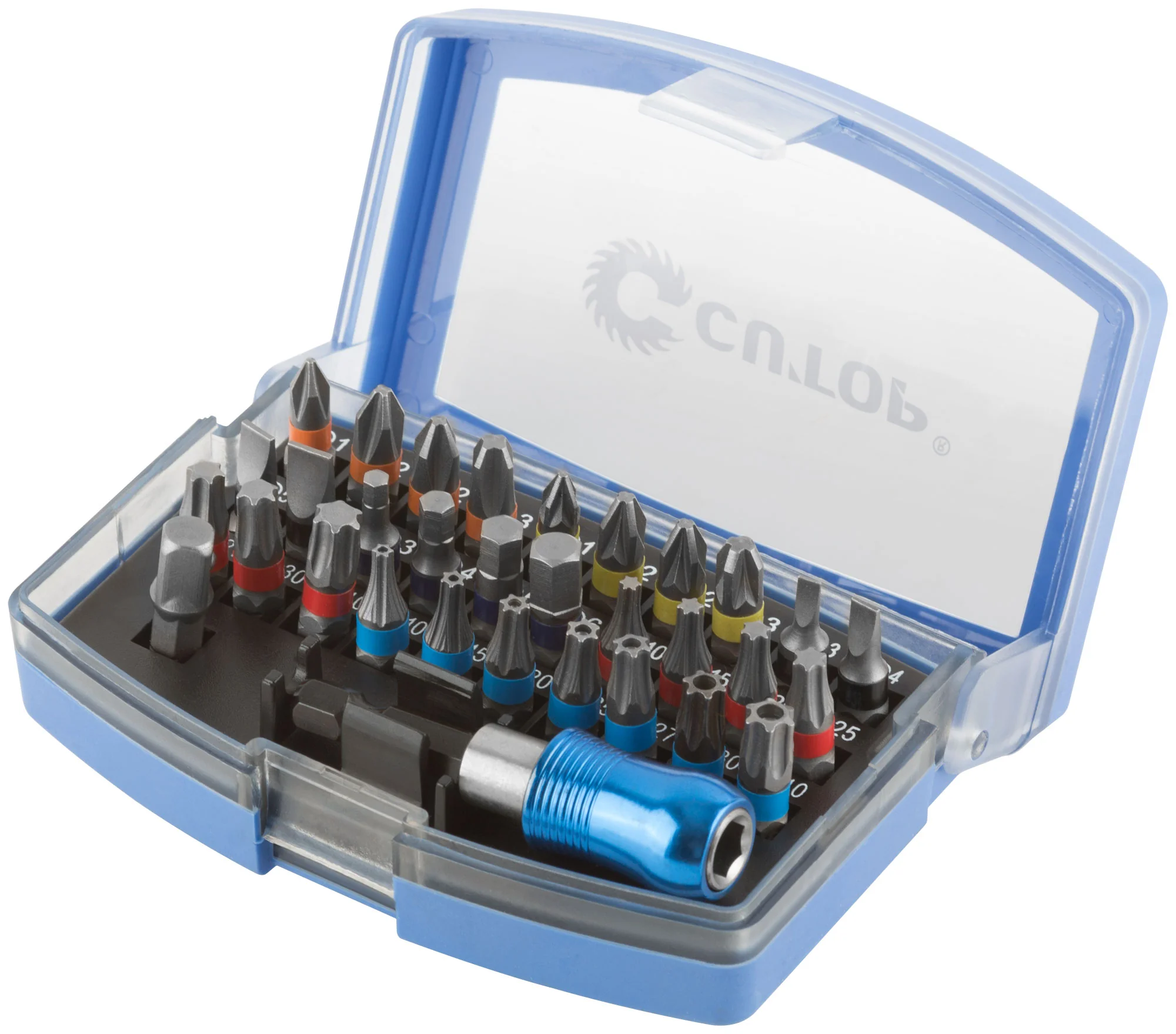 Благодаря намагниченному шлицу и антискользящим рискам, работа с битами становится более удобной и безопасной. Все элементы набора удобно размещены в компактном пластиковом боксе, что облегчает их хранение и транспортировку.