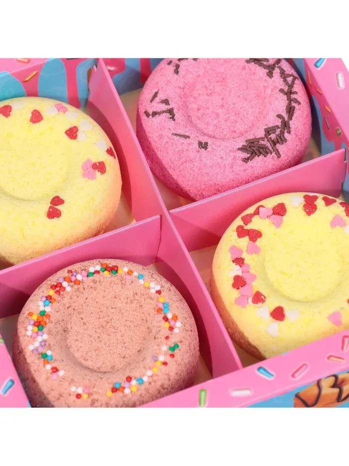 Подарите себе или близким радость и расслабление с набором бомбочек для ванн "Just Donuts". Этот набор из четырёх ароматных бомбочек подарит вам настоящую ванную церемонию, превращая обычное время для водных процедур в удивительный и расслабляющий опыт.