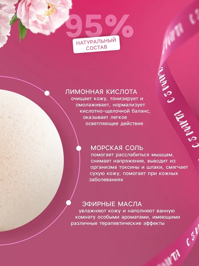 - В составе бомбочек могут быть натуральные экстракты и масла, которые обладают смягчающим и ухаживающим действием, поддерживая здоровье кожи и создавая эффект лёгкости и комфорта.