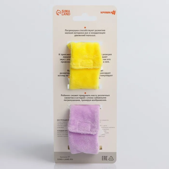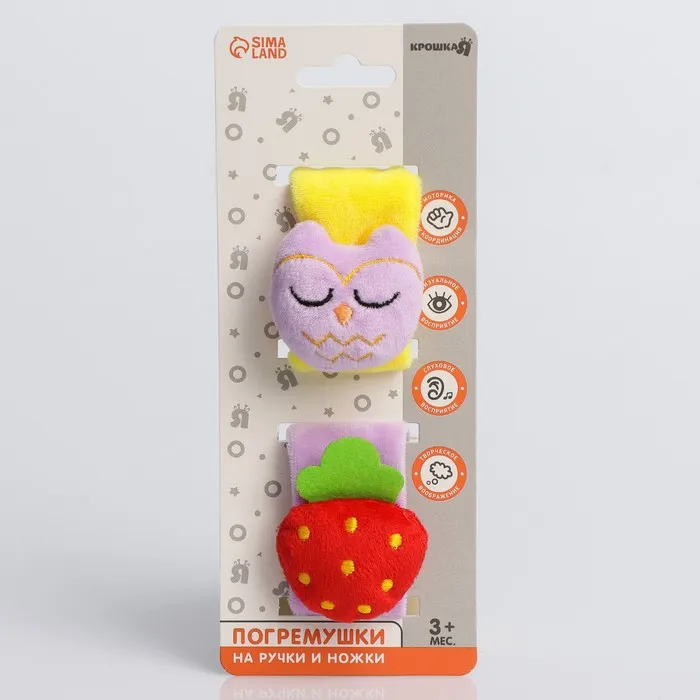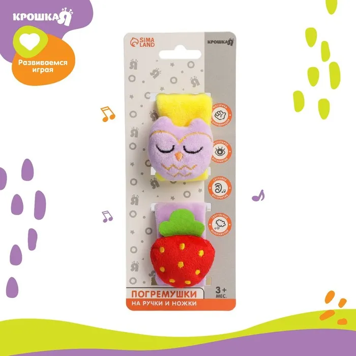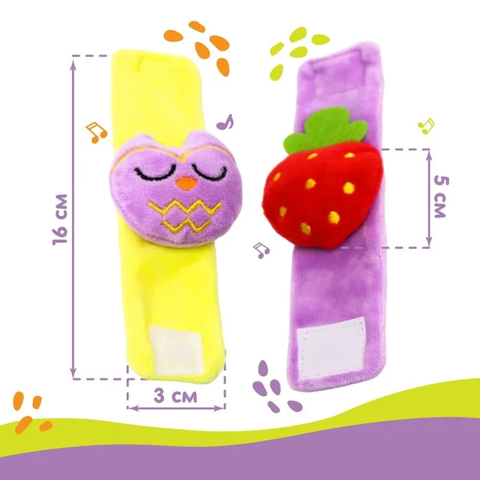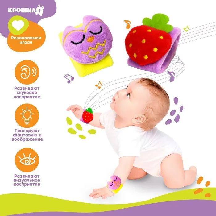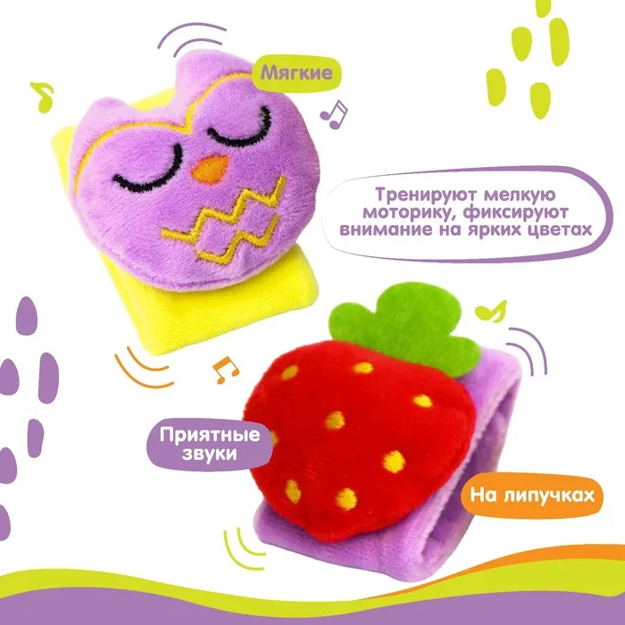 Развивающая игрушка выполнена в виде браслетика на липучке. В комплект входят две штуки. Их можно надеть малышу на ручки или ножки. Звуковые элементы будут греметь, когда непоседа сменит положение тела.