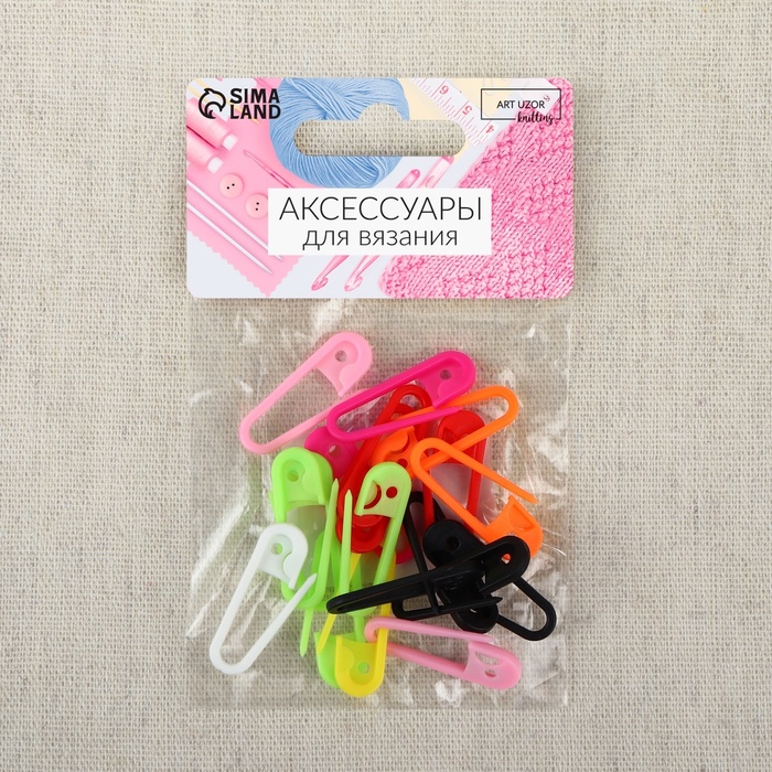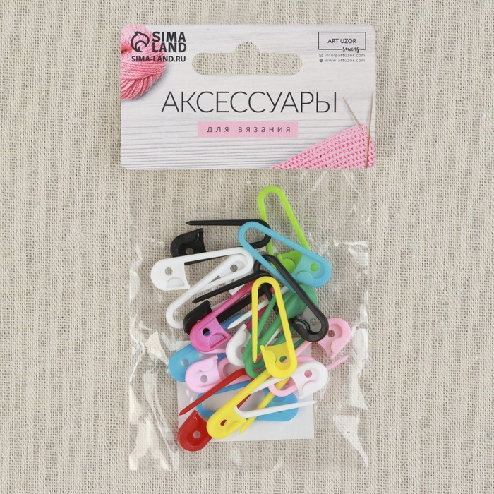 Длинный хвостик легко вдевается в петлю или столбик, затем фиксируется в замке, не деформирует и не растягивает вязку. Разными цветами удобно помечать участки в одном изделии: выделить спинку, пройму, полочку. Если допущена ошибка, можно за пару секунд снять и переставить булавку на другое место.