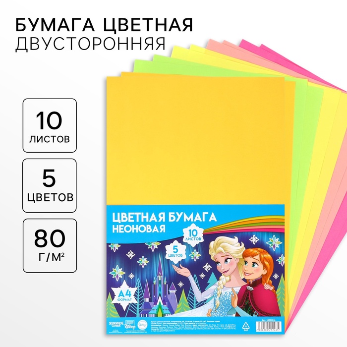 Цветная бумага тонированная, неоновая, А4, 10 листов, 5 цветов, немелованная, двусторонняя, в пакете, 80 г/м², «Холодное сердце»